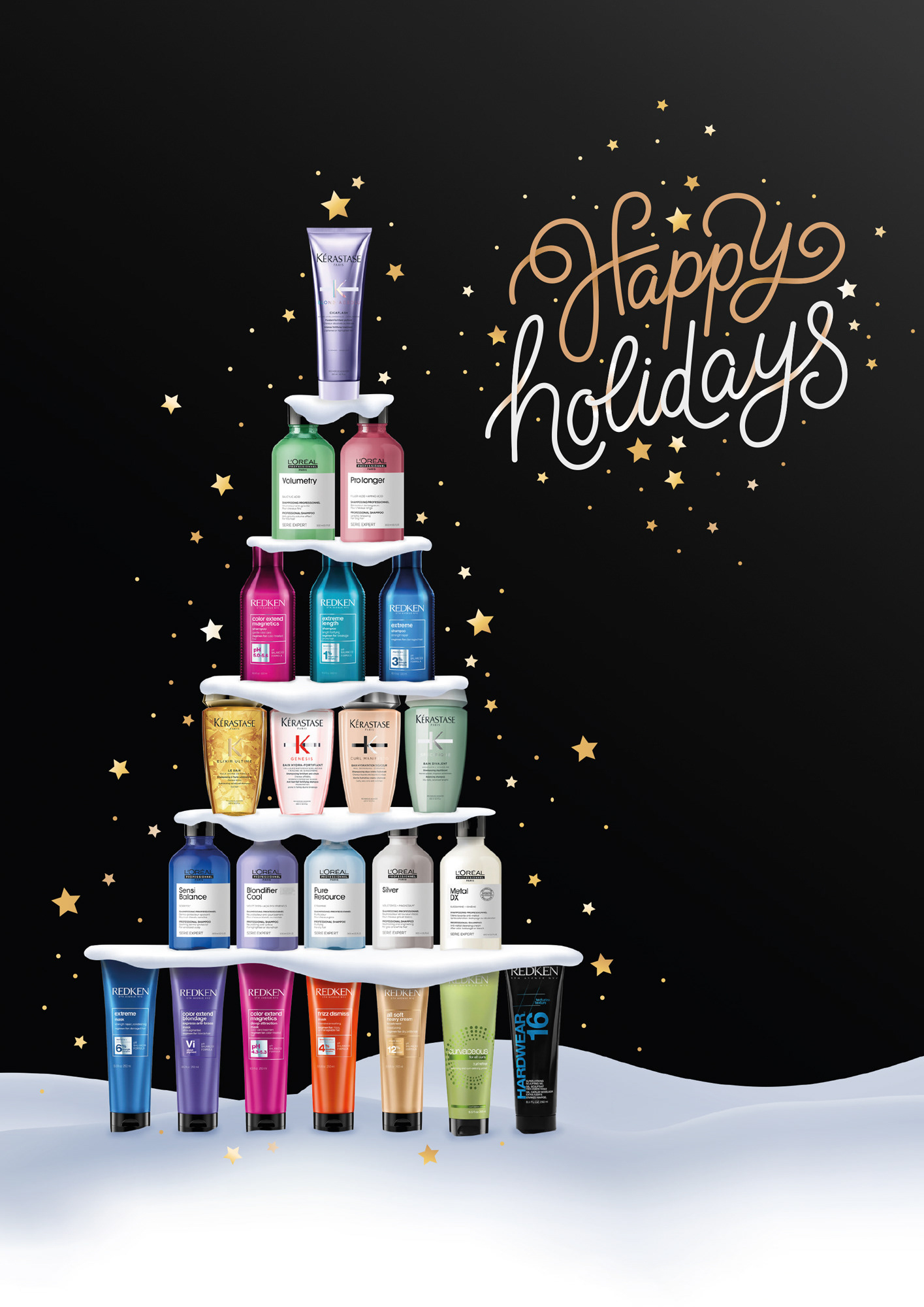 A B2B Christmas card designed to show off key brand products, stacked to form the shape of a Christmas tree.